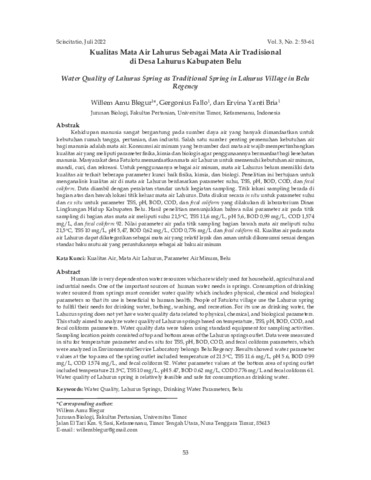 Willem, Amu Blegur and Gergonius, Fallo and Ervina, Yanti Bria (2022) Kualitas mata air Lahurus sebagai mata air tradisional di Desa Lahurus Kabupaten Belu. Sciscitatio: Journal for Biological Science, 3 (2): 1. pp. 53-61. ISSN 2721-5180