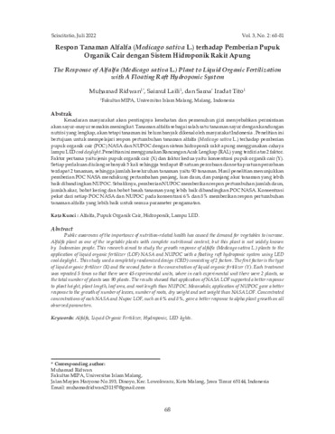 Muhamad, Ridwan and Saimul, Laili and Sama’, Iradat Tito (2022) Respon tanaman alfalfa (Medicago sativa L.) terhadap pemberian pupuk organik cair dengan sistem hidroponik rakit apung. Sciscitatio: Journal for Biological Science, 3 (2): 3. pp. 68-81. ISSN 2721-5180