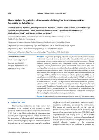 Olushola, Sunday Ayanda and Blessing, Oluwatobi Adeleye and Omolola, Helen Aremu and Folasade, Busayo Ojobola and Olayide, Samuel Lawal and Olusola, Solomon Amodu and Oyedele, Oyebamiji Oketayo and Michael, John Klink and Simphiwe, Maurice Nelana (2023) Photocatalytic degradation of metronidazole using zinc oxide nanoparticles supported on acha waste. Indonesian Journal of Chemistry (Indones. J. Chem), 23 (1): 15. pp. 158-169. ISSN 1411-9420 e_ISSN: 2460-1578