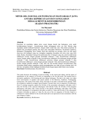 Ira, Mayasari (2021) Mitos ora ilok dalam pandangan masyarakat Jawa antara kepercayaan dan sanggahan sebagai bentuk kesembronoan (kajian pragmatik). Wacana: Jurnal Bahasa, Seni, dan Pengajaran, 5 (2): 1. pp. 1-15. ISSN 2085-2053