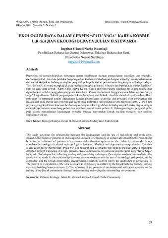 Ingghar, Ghupti Nadia Kusmiaji (2021) Ekologi budaya dalam cerpen “kayu naga” karya Korrie L.R (kajian ekologi budaya Julian H. Steward). Wacana: Jurnal Bahasa, Seni, dan Pengajaran, 5 (2): 3. pp. 22-32. ISSN 2085-2053
