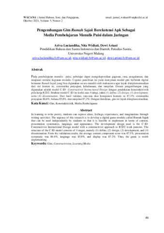 Ariva, Luciandika and Nita, Widiati and Dewi, Ariani (2021) Pengembangan gim rumah sajak berekstensi APK sebagai media pembelajaran menulis puisi dalam jaringan. Wacana: Jurnal Bahasa, Seni, dan Pengajaran, 5 (2): 5. pp. 46-55. ISSN 2085-2053