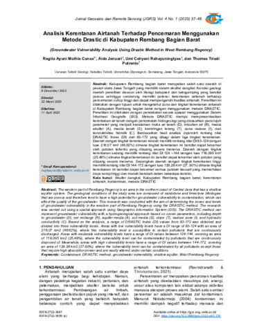 Regita, Ayuni Muthia Cansa and Aida, Januari and Umi, Cahyani Rahayuningtyas and Thomas, Triadi Putranto (2023) Analisis kerentanan airtanah terhadap pencemaran menggunakan metode DRASTIC di Kabupaten Rembang bagian Barat. JGRS: Jurnal Geosains dan Remote Sensing, 4 (1): 5. pp. 37-48. ISSN 2722-3647