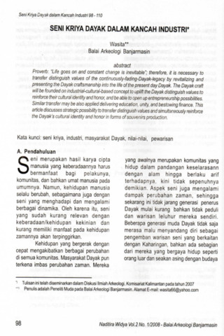 Wasita, Wasita (2008) Seni Kriya Dayak dalam kancah industri. Naditira Widya, 2 (1): 10. pp. 98-110. ISSN 1410 - 0932