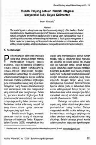 Imam, Hindarto (2008) Rumah Panjang sebuah Wantah integrasi masyarakat suku Dayak Kalimantan. Naditira Widya, 2 (1): 11. pp. 111-120. ISSN 1410 - 0932