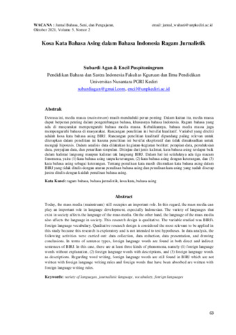 Subardi, Agan and Encil, Puspitoningrum (2021) Kosa kata bahasa asing dalam bahasa Indonesia ragam jurnalistik. Wacana: Jurnal Bahasa, Seni, dan Pengajaran, 5 (2): 7. pp. 63-74. ISSN 2085-2053