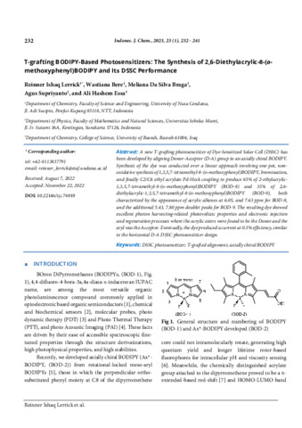Reinner, Ishaq Lerrick and Wastiana, Bere and Meliana, Da Silva Braga and Agus, Supriyanto and Ali, Hashem Essa (2023) T-grafting BODIPY-based photosensitizers: The synthesis of 2,6-Diethylacrylic-8-(omethoxyphenyl)BODIPY and Its DSSC performance. Indonesian Journal of Chemistry (Indones. J. Chem), 23 (1): 21. pp. 232-241. ISSN 1411-9420 e_ISSN: 2460-1578
