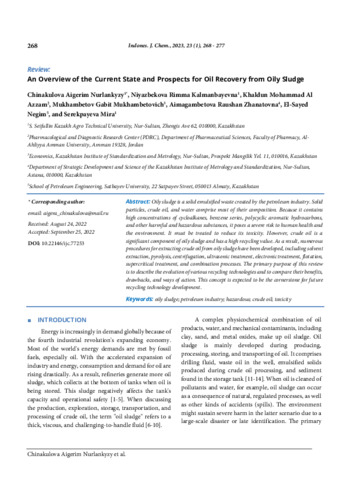 Chinakulova, Aigerim Nurlankyzy and Niyazbekova, Rimma Kalmanbayevna and Khaldun, Mohammad Al Azzam and Mukhambetov, Gabit Mukhambetovich and Aimagambetova, Raushan Zhanatovna and El-Sayed, Negim and Serekpayeva, Mira (2023) Review: An overview of the current state and prospects for oil recovery from oily sludge. Indonesian Journal of Chemistry (Indones. J. Chem), 23 (1): 24. pp. 268-277. ISSN 1411-9420 e_ISSN: 2460-1578