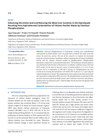 Agus, Kuncaka and Wahyu, Tri Supardi and Winarto, Haryadi and Adhitasari, Suratman and Priatmoko, Priatmoko (2023) Note: Enhancing the amino acid and reducing the metal ions contents in the hydrolysate resulting from hydrothermal carbonization of chicken feather waste by chemical phosphorylation. Indonesian Journal of Chemistry (Indones. J. Chem), 23 (1): 25. pp. 278-284. ISSN 1411-9420 e_ISSN: 2460-1578