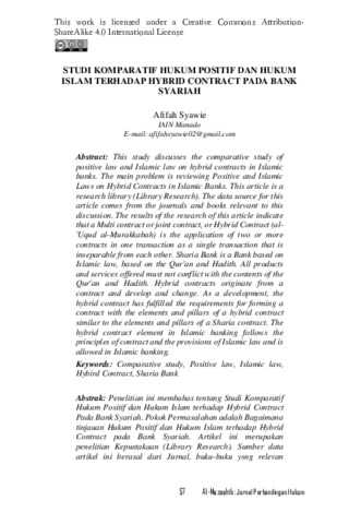 Penelitian ini membahas tentang Studi Komparatif Hukum Positif dan Hukum Islam terhadap Hybrid Contract Pada Bank Syariah. Pokok Permasalahan adalah Bagaimana tinjauan Hukum Positif dan Hukum Islam terhadap Hybrid Contract pada Bank Syariah. Artikel ini merupakan penelitian Kepustakaan (Library Research). Sumber data artikel ini berasal dari Jurnal, buku-buku ysng relevan dengan pembahasan ini. Hasil penelitian artikel ini menunjukkan bahwa Multi akad atau akad gabungan atau disebut juga dengan Hybrid Contract (al-‘Uqud alMurakkabah) merupakan penerapan dua atau lebih akad dalam satu transaksi sebagai satu kesatuan transaksi yang tidak terpisahkan satu sama lain. Bank Syariah adalah Bank yang didasarkan atas hukum islam, didasarkan pada al-Qur’an dan Hadits. semua produk dan jasa yang ditawarkan tidak boleh bertentangan dengan isi al-Qur’an dan Hadits. Hybrid contract berasal dari sebuah akad dan berkembang serta berubah. Sebagai perkembangan, hybird contract sudah memenuhi syarat terbentuknya sebuah akad dengan adanya unsur-unsur serta rukun hybrid contract yang serupa dengan unsur-unsur serta rukun suatu akad Syariah. Unsur hybrid contract yang terdapat dalam perbankan syariah sudah sesuai prinsip akad dan ketentuan hukum Islam dan diperbolehkan dalam perbankan Syariah.