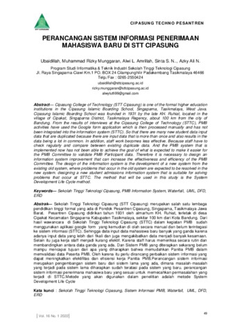 Sekolah Tinggi Teknologi Cipasung (STT Cipasung) merupakan salah satu lembaga pendidikan tinggi formal yang ada di Pondok Pesantren Cipasung, Singaparna, Tasikmalaya Jawa Barat. Pesantren Cipasung didirikan tahun 1931 oleh almarhum KH. Ruhiat, terletak di desa Cipakat Kecamatan Singaparna Kabupaten Tasikmalaya, sekitar 100 km dari Kota Bandung. Dari hasil wawancara di Sekolah Tinggi Teknologi Cipasung (STTC) dalam kegiatan PMB sudah menggunakan aplikasi google formmyang kemudian di olah secara manual dan belum terintegasi ke sistem informasi (STTC). Sehingga data input data mahasiswa baru banyak yang ganda karena adanya input data yang lebih dari 1kali dan juga mengakibatkan data menjadi banyak kesamaan. Selain itu juga kerja staff menjadi kurang efektif. Karena staff harus memeriksa secara rutin dan membandingkan antara data ganda yang ada. Dan Sistem PMB yang diterapkan sekarang belum mampu mencapai tujuan dari apa yang diharapkan bahwa memudahkan Panitia PMB dalam memvalidasi data Peserta PMB. Oleh karena itu perlu dirancang perbaikan sistem informasi yang dapat meningkatkan efektifitas dan efisiensi kerja Panitia PMB. Perancangan sistem informasi merupakan pengembangan sistem baru dari sistem lama yang ada, dimana masalah-masalah yang terjadi pada sistem lama diharapkan sudah teratasi pada sistem yang baru. Perancangan sistem informasi penerimaan mahasiwa baru yang sesuai untuk memecahkan permasalahan yang terjadi di STTC. Metode yang akan digunakan dalam penelitian adalah metode System Development Life Cycle.