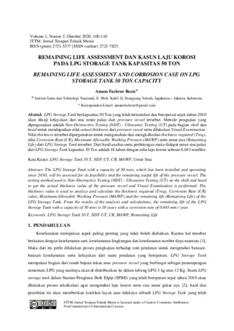 Amam Fachrur, Rozie (2020) Remaining life assessment dan kasus laju korosi pada LPG storage tank kapasitas 50 Ton. JTTM: Jurnal Terapan Teknik Mesin, 1 (2): 6. pp. 100-110. ISSN 2721-5377