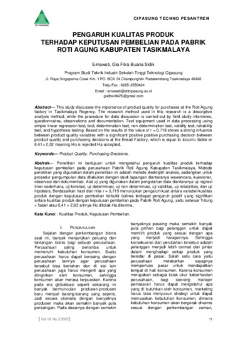 Ernawati, Ernawati and Sidik, Gia Fitra Buana (2022) Pengaruh kualitas produk terhadap keputusan pembelian pada pabrik roti agung Kabupaten Tasikmalaya. Cipasung Techno Pesantren: Jurnal Ilmiah, 16 (2): 2. pp. 11-25. ISSN 1978-0842