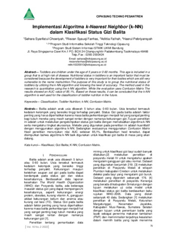 | Uncontrolled Keywords: | Klasifikasi, Gizi balita, K-NN, Confusion matrix, Nutritional status, Toddlers |