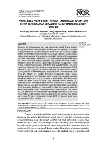 Khususiyah, Khususiyah and Nora, Yuniar Setyaputri and Galang, Surya Gumilang and Rosalia, Dewi Nawantara (2019) Penggunaan proses guru (ground, understand, revice, use) untuk meningkatkan efikasi diri karier mahasiswa calon guru BK. Nusantara of Research: Jurnal Hasil-hasil Penelitian Universitas Nusantara PGRI Kediri, 6 (1): 2. pp. 16-25. ISSN 2579-3063