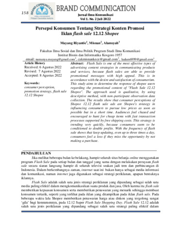 Mayang, Riyantie and Misnan, Misnan and Alamsyah, Alamsyah (2022) Persepsi konsumen tentang strategi konten promosi iklan flash sale 12.12 Shopee. Brand Communication, 1 (2): 9. pp. 158-169. ISSN 2829-8144