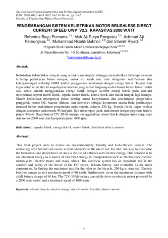 Robertus Bayu, Purnama and Moh Aji Surya, Pangestu and Achmad Aji, Pamungkas and Muhammad Rizaldi, Bukhori and Slamet, Riyadi (2022) Pengembangan sistem kelistrikan motor Brushless Direct Current Speed UWP v2.2 kapasitas 2000 watt. The Journal of System Engineering and Technological Innovation (JISTI), 1 (1): 2. pp. 7-12. ISSN 2828-4003