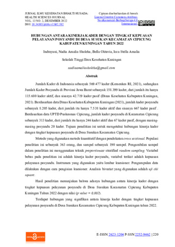 Indrayani, Indrayani and Nadia, Amalia Sholeha and Bella, Oktavia and Icca, Stella Amalia (2022) Hubungan antara kinerja kader dengan tingkat kepuasan pelayanan posyandu di Desa Susukan Kecamatan Cipicung Kabupaten Kuningan tahun 2022. Jurnal Ilmu Kesehatan Bhakti Husada: Health Science Journal, 13 (2): 10. pp. 220-229. ISSN 2623-1204