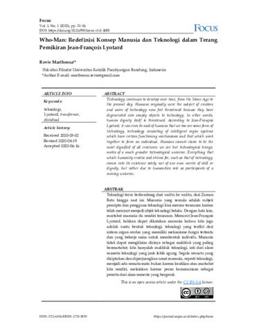 Revie, Marthensa (2020) Who-Man: Redefinisi konsep manusia dan teknologi dalam terang pemikiran Jean-Franҫois Lyotard. Focus, 1 (1): 4. pp. 21-26. ISSN 2722-6336
