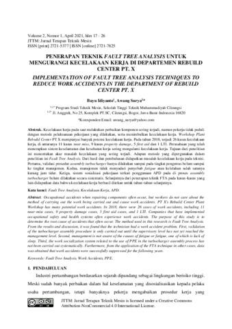 Bayu, Idiyanto and Awang, Surya (2021) Penerapan teknik fault tree analysis untuk mengurangi kecelakaan kerja di Departemen Rebuild Center PT. X. JTTM: Jurnal Terapan Teknik Mesin, 2 (1): 3. pp. 17-26. ISSN 2721-5377