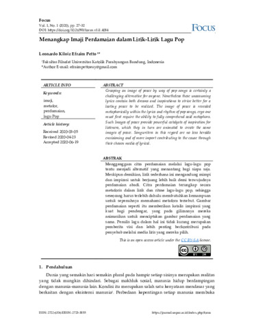 Leonardo, Kiloiz Efraim Petto (2020) Menangkap imaji perdamaian dalam lirik-lirik lagu Pop. Focus, 1 (1): 5. pp. 27-31. ISSN 2722-6336