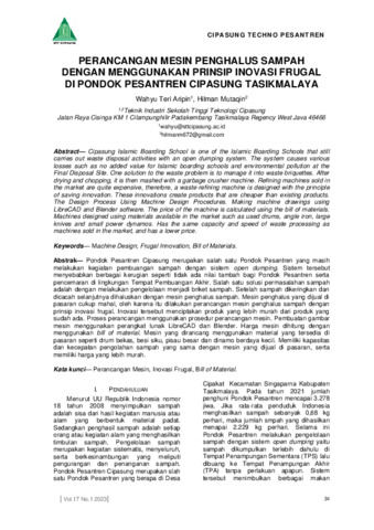Aripin, Wahyu Teri and Mutaqin, Hilman (2023) Perancangan mesin penghalus sampah dengan menggunakan prinsip inovasi frugal di Pondok Pesantren Cipasung Tasikmalaya. Cipasung Techno Pesantren: Jurnal Ilmiah, 17 (1): 5. pp. 34-45. ISSN 1978-0842