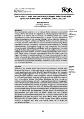 Pemahaman karir dimaknai sebagai usaha individu untuk memahami diri baik sikap, kemampuan, dan minatnya. Pentingnya pemahaman terhadap informasi karir dan dunia kerja menjadi tugas tersendiri bagi individu. Di Sekolah Dasar (SD) pemahaman karir merupakan permasalahan yang sering dialami siswa. Hal ini muncul saat siswa merasa tidak yakin akan memilih jenjang karir apa di masa depan dan bagaimana menyusun strategi agar kemampuan dan cita-citanya dapat terwujud. Siswa juga belum dapat menentukan kemampuan, bakat dan minat yang dimilikinya sehingga menyebabkan kebingungan dan tentu membutuhkan bimbingan. peneliti memandang perlu untuk menerapkan layanan informasi menggunakan papan bimbingan sebagai upaya membantu siswa meningkatkan pemahaman karirnya. Jenis penelitian ini adalah Quasi Experimental Design yang menggunakan desain penelitian equivalent time series design. Atas dasar hasil penelitian dapat diperoleh kesimpulan layanan informasi menggunakan papan bimbingan dapat mempengaruhi pemahaman karir siswa sekolah dasar. Analisis kelompok dilakukan dengan cara mentabulasi dan menggambarkan grafik skor pretest dan postest. Secara visual, hasil penelitian menunjukkan ada peningkatan pemahaman karir yang meliputi pemahaman diri dan pemahaman dunia kerja. Kesimpulan yang dapat diperoleh adalah temuan teoritis dalam penelitian ini dapat dijadikan sebagai informasi dalam bidang bimbingan mengenai pemahaman karir pada siswa sekolah dasar, hal ini dilihat dari