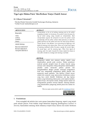 R. F. Bhanu, Viktorahadi (2020) Tiga lapis makna puisi ‘Aku Berkaca’ Karya Chairil Anwar. Focus, 1 (1): 6. pp. 33-40. ISSN 2722-6336