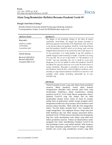 Hengki, Ario Putra Ginting (2020) Alam yang bermetafor: Refleksi bersama pandemi Covid-19. Focus, 1 (2): 1. pp. 41-48. ISSN 2722-6336
