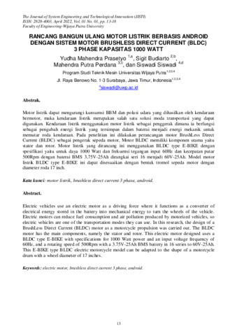 Yudha Mahendra, Prasetyo and Sigit, Budiarto and Mahendra Putra, Perdana and Siswadi, Siswadi (2022) Rancang bangun ulang motor listrik berbasis android dengan sistem motor Brushless Direct Current (BLDC) 3 phase kapasitas 1000 watt. The Journal of System Engineering and Technological Innovation (JISTI), 1 (1): 3. pp. 13-18. ISSN 2828-4003