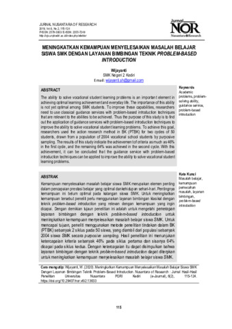 Kemampuan menyelesaikan masalah belajar siswa SMK merupakan elemen penting dalam pencapaian prestasi belajar yang optimal dankehidupan sehari-hari. Pentingnya kemampuan ini belum optimal pada kalangan siswa SMK. Untuk meningkatkan kemampuan tersebut peneliti perlu menggunakan layanan bimbingan klasikal dengan teknik problem-based introduction yang relevan dengan kemampuan yang ingin dicapai. Dengan demikian tujaun penelitian ini adalah untuk mengetahi penerapan layanan bimbingan dengan teknik problem-based introduction untuk meningkatkan kemampuan menyelesaikan masalah belajar siswa SMK. Untuk mencapai tujuan, peneliti menggunakan metode penelitian tindakan dalam BK (PTBK) sebanyak 2 siklus pada 50 siswa, yang diambil dari populasi sebanyak 2004 siswa SMK secara purposive sampling. Hasil penelitian ini menunjukan ketercapaian kriteria sebanyak 46% pada siklus pertama dan sisanya 64% dicapai pada siklus kedua. Dengan ketercapaian itu dapat disimpulkan bahwa layanan bimbingan dengan teknik problem-based introduction dapat diterpkan untuk meningkatkan kemampuan menyelesaikan masalah belajar siswa SMK.