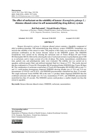 Beti, Pudyastuti and Triyadi Hendra, Wijaya (2022) The effect of surfactant on the solubility of kencur (Kaempferia galanga L.) rhizome ethanol extract in self nanoemulsifying drug delivery system. Pharmaciana: Jurnal Kefarmasian, 12 (3): 6. pp. 319-326. ISSN 2088-4559