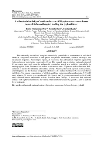 Rinto Muhammad, Nur and Resmila, Dewi and Sutriani, Kaliu (2022) Antibacterial activity of methanol extract Rhizophora mucronata leaves toward Salmonella typhi: leading the typhoid fever. Pharmaciana: Jurnal Kefarmasian, 12 (3): 11. pp. 364-371. ISSN 2088-4559