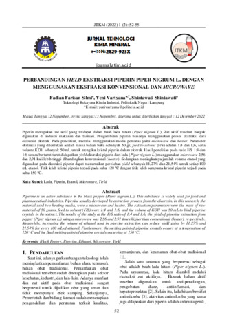 Fadian, Farisan Silmi and Yeni, Variyana and Shintawati, Shintawati (2022) Perbandingan yield ekstraksi piperin Piper nigrum L. dengan menggunakan ekstraksi konvensional dan microwave. Jurnal Teknologi Kimia Mineral, 1 (2): 2. pp. 52-55. ISSN 2829-923X
