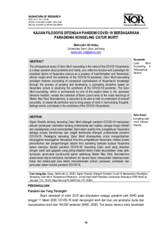 Bakhrudin, All Habsy (2020) Kajian filosofis di tengah pandemi Covid-19 berdasarkan paradigma konseling catur murti. Nusantara of Research: Jurnal Hasil-hasil penelitian Universitas Nusantara PGRI Kediri, 7 (1): 3. pp. 19-29. ISSN 2579-3063