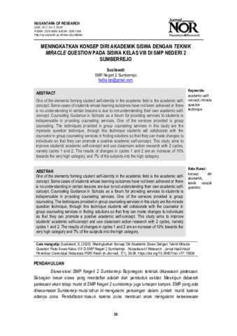 Susilawati, Susilawati (2020) Meningkatkan konsep diri akademik siswa dengan teknik miracle question pada siswa kelas VIII di SMP Negeri 2 Sumberrejo. Nusantara of Research: Jurnal Hasil-hasil penelitian Universitas Nusantara PGRI Kediri, 7 (1): 4. pp. 30-36. ISSN 2579-3063