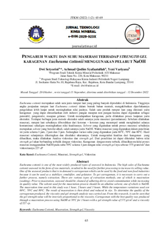 Dwi, Setyorini and Achmad, Qodim Syafaatullah and Yeni, Variyana (2022) Pengaruh waktu dan suhu maserasi terhadap strength gel karagenan Eucheuma cottonii menggunakan pelarut NaOH. Jurnal Teknologi Kimia Mineral, 1 (2): 5. pp. 65-69. ISSN 2829-923X