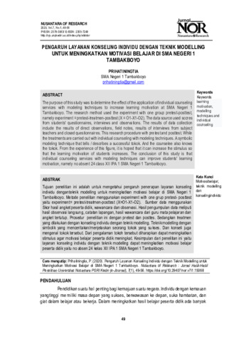 Prihatiningtia, Prihatiningtia (2020) Pengaruh layanan konseling individu dengan teknik modelling untuk meningkatkan motivasi belajar di SMA Negeri 1 Tambakboyo. Nusantara of Research: Jurnal Hasil-hasil penelitian Universitas Nusantara PGRI Kediri, 7 (1): 6. pp. 49-56. ISSN 2579-3063