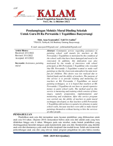 Moh., Anas Syamsudin and Yuli, Tri Andini (2022) Pendampingan melukis mural dinding sekolah untuk guru di RA Perwanida 1 Tegaldlimo Banyuwangi. Jurnal Pengabdian Kepada Masyarakat Kalam, 1 (3): 1. pp. 126-134. ISSN 2829-8241