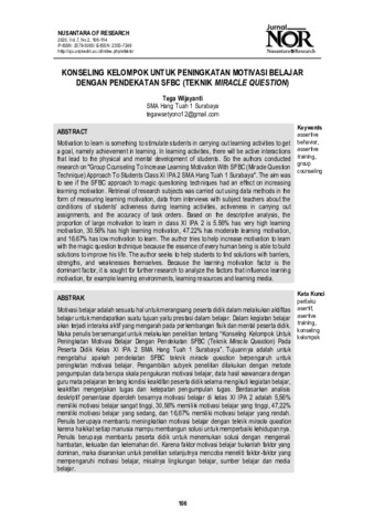Tega, Wijayanti (2020) Konseling kelompok untuk peningkatan motivasi belajar dengan pendekatan SFBC (teknik miracle question). Nusantara of Research: Jurnal Hasil-hasil Penelitian Universitas Nusantara PGRI Kediri, 7 (2): 7. pp. 106-114. ISSN 2579-3063
