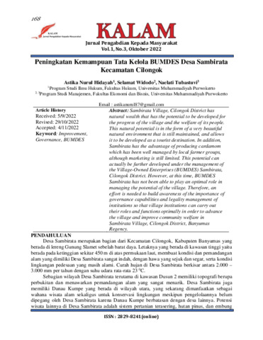 Astika, Nurul Hidayah and Selamat, Widodo and Naelati, Tubastuvi (2022) Peningkatan kemampuan tata kelola BUMDES Desa Sambirata Kecamatan Cilongok. Jurnal Pengabdian Kepada Masyarakat Kalam, 1 (3): 6. pp. 168-173. ISSN 2829-8241