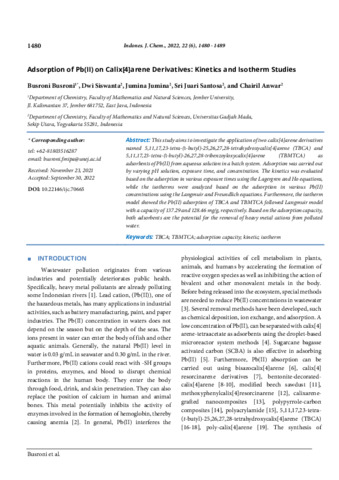 Busroni, Busroni and Dwi, Siswanta and Jumina, Jumina and Sri, Juari Santosa and Chairil, Anwar (2022) Adsorption of Pb(II) on Calix[4]arene derivatives: kinetics and isotherm studies. Indonesian Journal of Chemistry (Indones. J. Chem), 22 (6): 2. pp. 1480-1489. ISSN 1411-9420 e_ISSN: 2460-1578