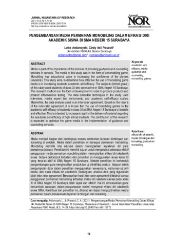 Lofes, Ardiansyah and Cindy, Asli Pravesti (2021) Pengembangan media permainan monobiling dalam efikasi diri akademik siswa di SMA Negeri 15 Surabaya. Nusantara of Research: Jurnal Hasil-hasil Penelitian Universitas Nusantara PGRI Kediri, 8 (1): 2. pp. 14-24. ISSN 2579-3063