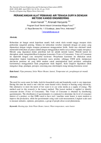 Imam, Hanafi and Krisnadi, Hariyanto (2022) Perancangan alat pemanas air tenaga surya dengan metode Kansei Engineering. The Journal of System Engineering and Technological Innovation (JISTI), 1 (1): 4. pp. 19-24. ISSN 2828-4003