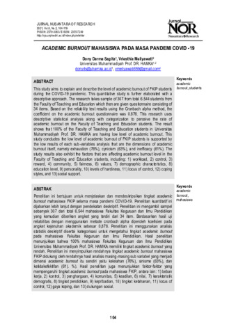 Dony, Darma Sagita and Vriesthia, Meilyawati (2021) Academic burnout mahasiswa pada masa pandemi Covid-19. Nusantara of Research: Jurnal Hasil-hasil Penelitian Universitas Nusantara PGRI Kediri, 8 (2): 4. pp. 104-119. ISSN 2579-3063