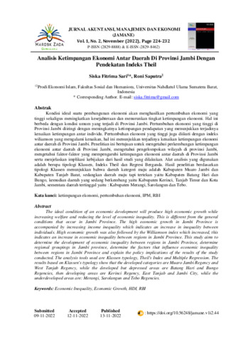 Siska, Fitrima Sari and Roni, Saputra (2022) Analisis ketimpangan ekonomi antar daerah di Provinsi Jambi dengan pendekatan indeks Theil. Jurnal Akuntansi, Manajemen dan Ekonomi (Jamane), 1 (2): 6. pp. 224-232. ISSN 2829-8888