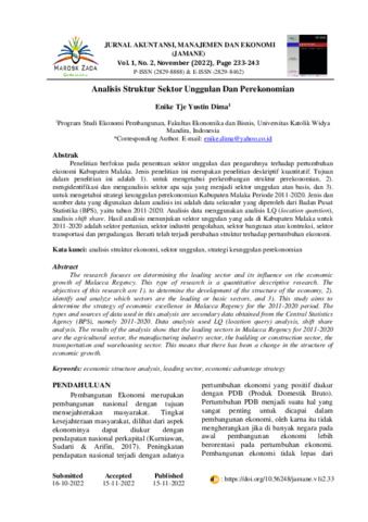 Enike, Tje Yustin Dima (2022) Analisis struktur sektor unggulan dan perekonomian. Jurnal Akuntansi, Manajemen dan Ekonomi (Jamane), 1 (2): 7. pp. 233-243. ISSN 2829-8888
