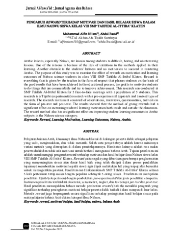 | Uncontrolled Keywords: | Motivasi belajar, Hasil belajar, Bahasa Arab, Learning motivation, Reward, Academic achievement, Arabic language, Nahwu |