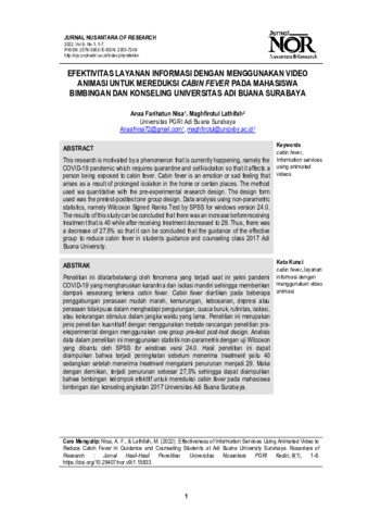 Anaa, Farihatun Nisa and Maghfirotul, Lathifah (2022) Efektivitas layanan informasi dengan menggunakan video animasi untuk mereduksi cabin fever pada mahasiswa bimbingan dan konseling Universitas Adi Buana Surabaya. Nusantara of Research: Jurnal Hasil-hasil Penelitian Universitas Nusantara PGRI Kediri, 9 (1): 1. pp. 1-7. ISSN 2579-3063