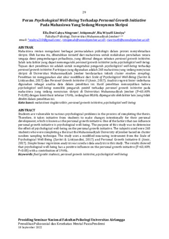 Ella, Dwi Cahya Ningrum and Istiqomah, Istiqomah and Ria, Wiyatfi Linsiya (2023) Peran psychological well-being terhadap personal growth initiative pada mahasiswa yang sedang menyusun skripsi. Proceeding Series of Psychology, 1: 4. pp. 29-44. ISSN 2986-1101